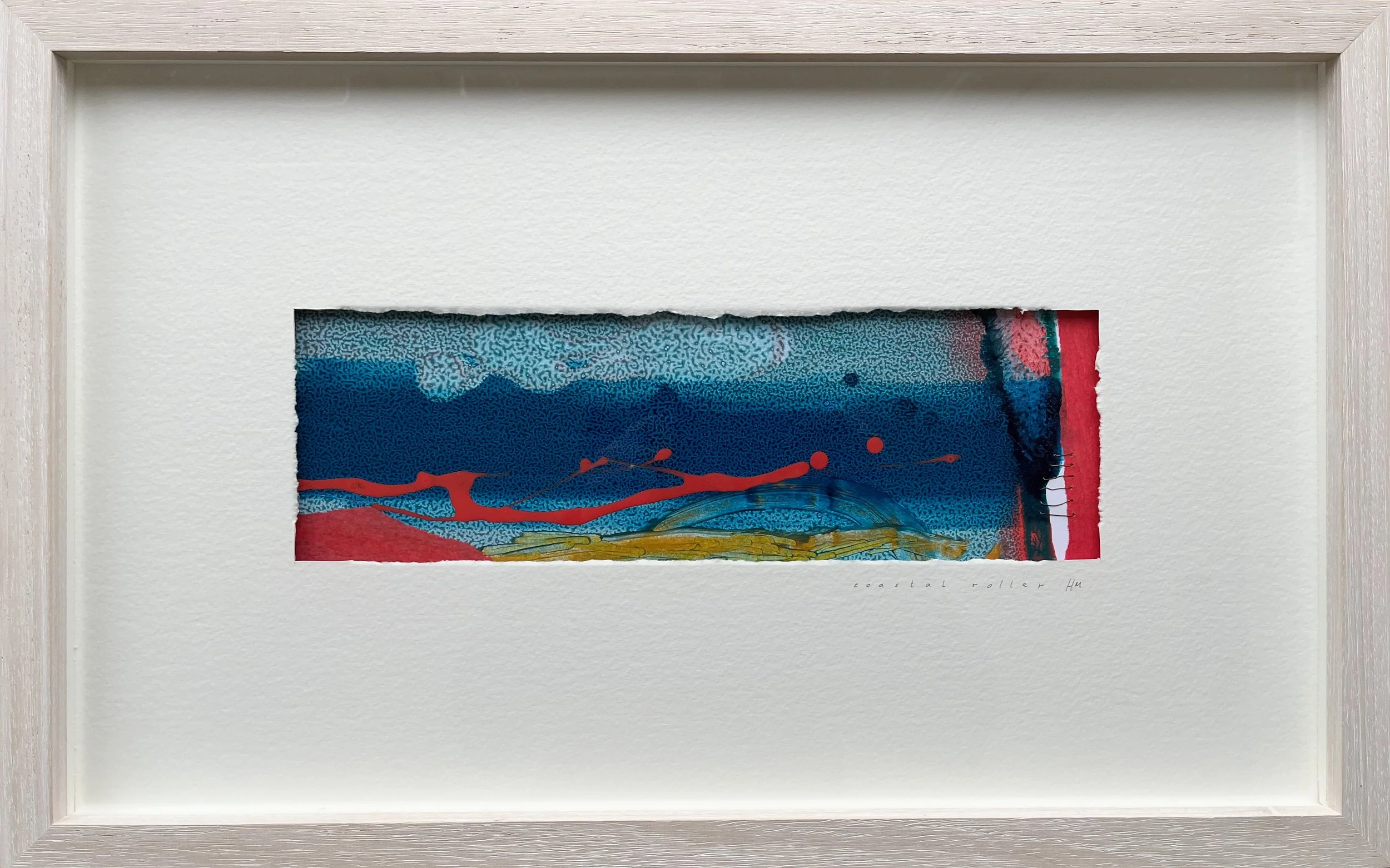 Coastal Roller - early dawn is just appearing, the waves caress the shingle beach, the taste of salt on lips but suddenly a living shadow fills the air - humming, tilting, swooping. Not something menacing. One hundred thousand birds take to the air rocking and rolling along the coastline. Something magical. This piece was created use the exhilarating chance happenings of mono screen printing then finished with acrylic ink, oil stick and wire.