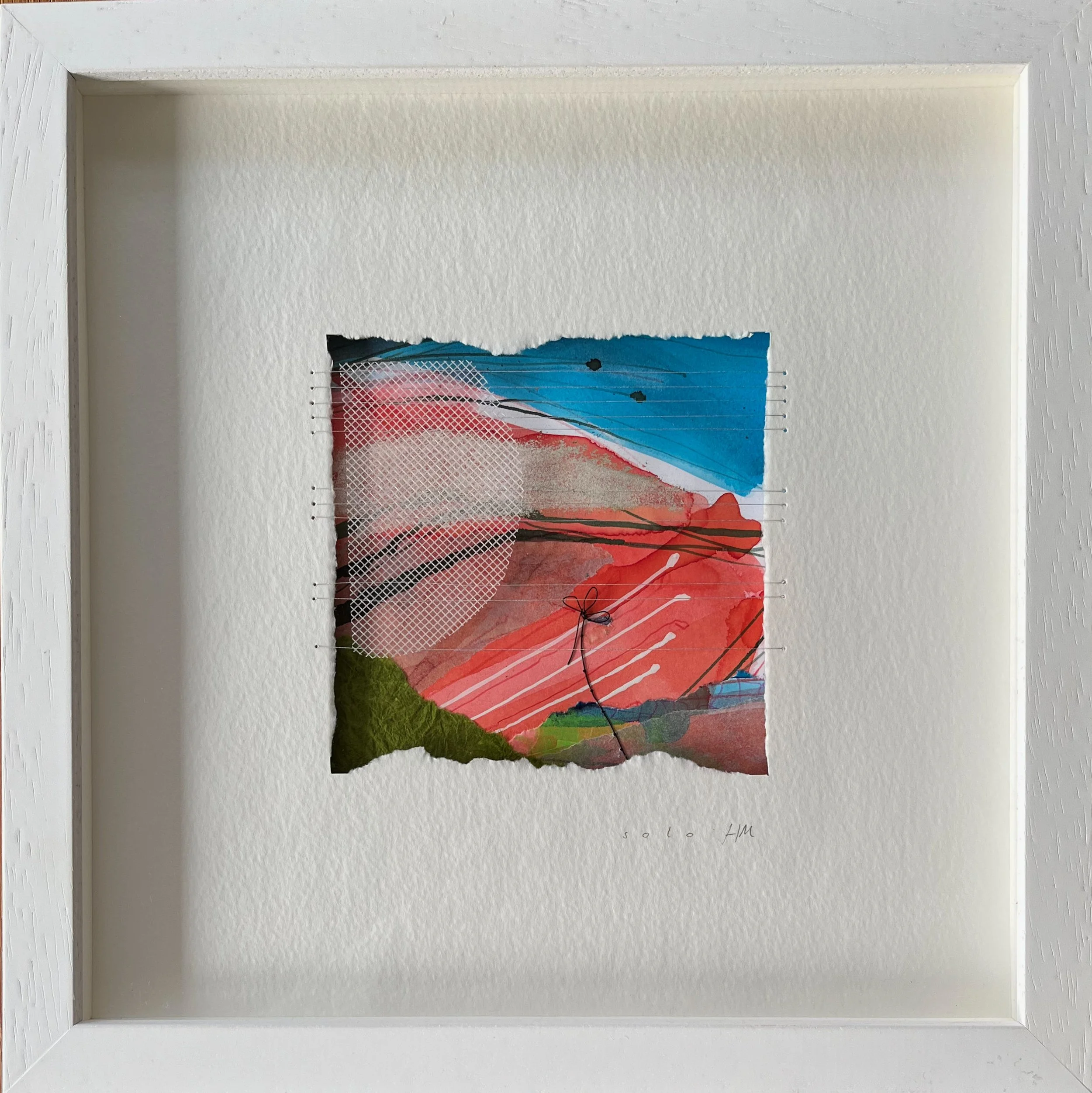 Solo- is a piece that considers solitariness and fragility. One single flower is illuminated by the moonlight whilst shadows suggesting other plants loom overhead but still the flower seems to be apart from the group. Ink wash, collaged papers, silver leaf and suspended mesh combine together to complete this mixed media piece.